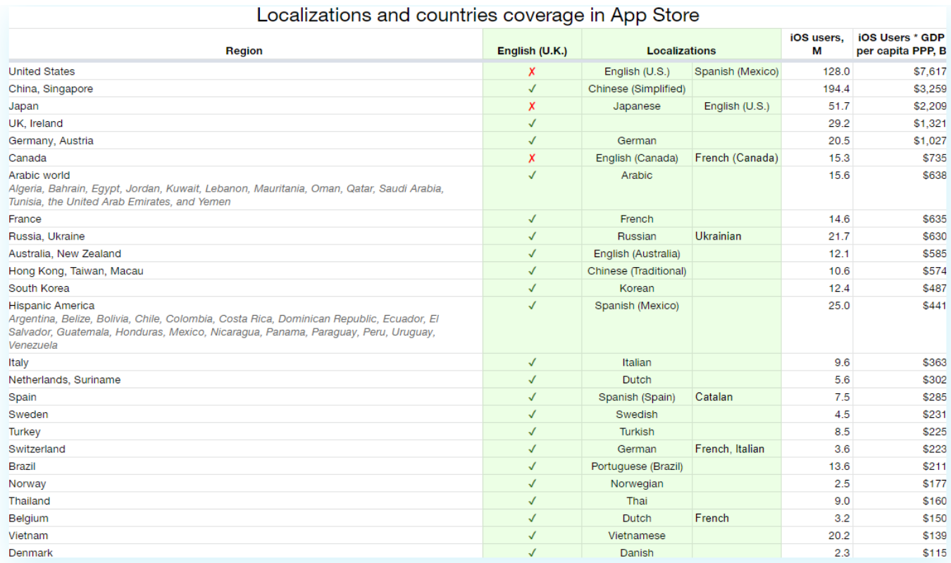 На данный момент в App Store доступно 39 локализаций и 31 язык. Это 4 английской локали, 3 испанской локалии, 2 варианта французского, 2 варианта португальского и 2 варианта китайского. Их действительно много. Если мобильное приложение работает не на один рынок, то как определиться, с какими локалиями работать прежде всего?