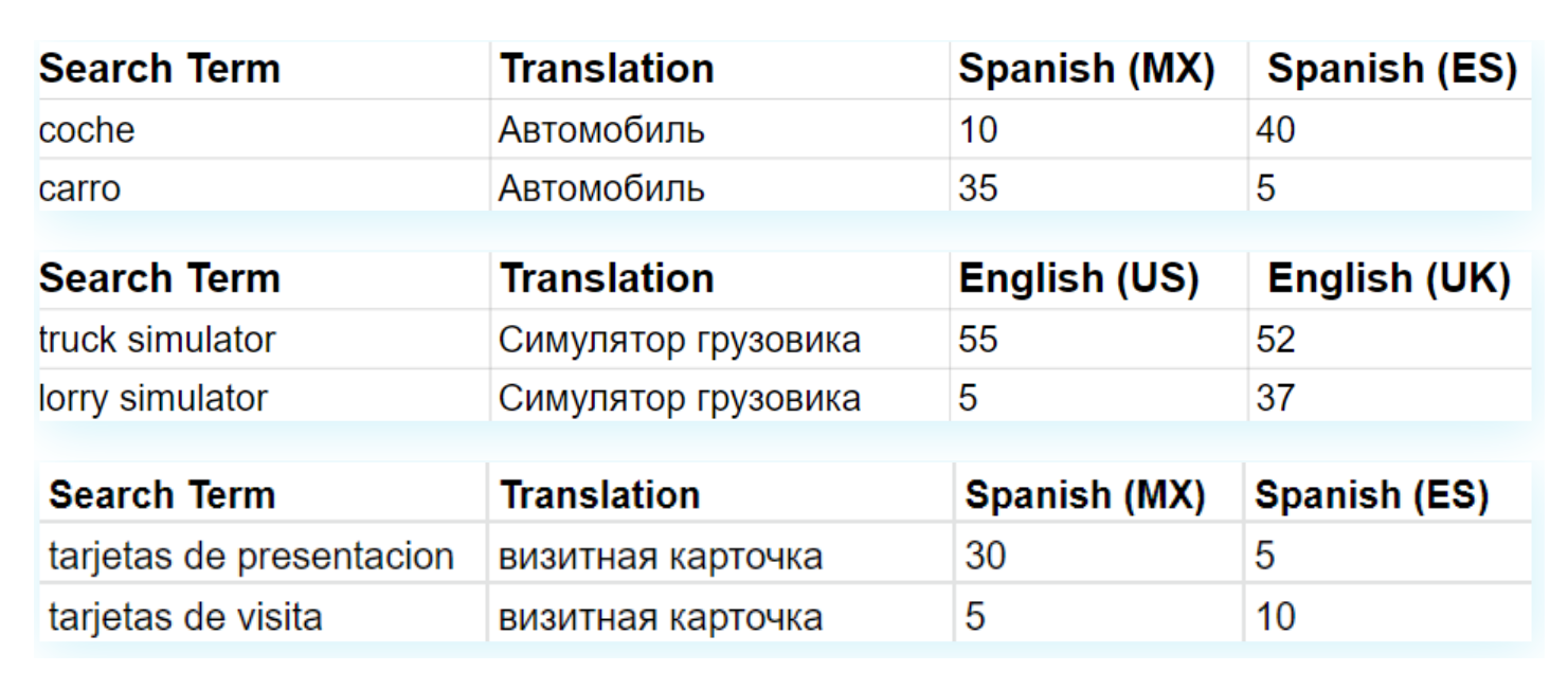 Например, у вас есть слово «автомобиль». Google Translate или даже нейтив переведёт его правильно, но может быть что у них не будет никакой популярности. Однако, автомобиль по-испанском «coche» для Мексики будет менее популярным, чем для Испании. Потому что в Мексике слово coche практически не используют, а употребляют вместо него слово carro. Аналогичная ситуация и в Испании. Таким образом, если вы добавите в метаданные в Мексике слово coche, то вы потеряете большой потенциал трафика, потому что правильнее использовать слово carro.