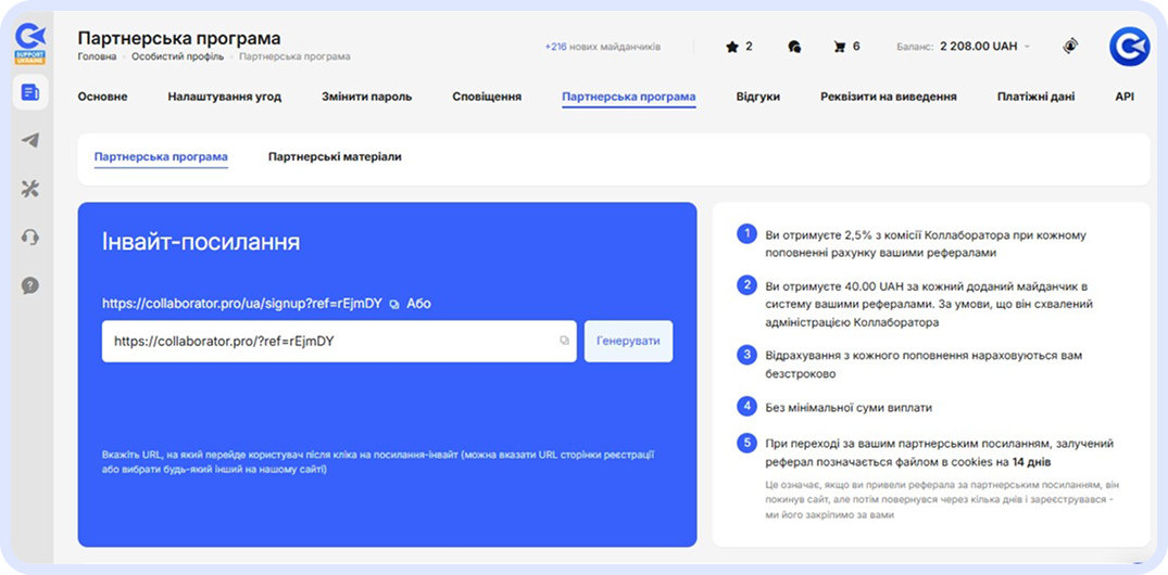 Партнерська програма має стандартні умови: 2,5% від комісії Коллаборатора (2,5% чистого доходу за партнеркою від поповнень клієнтів).